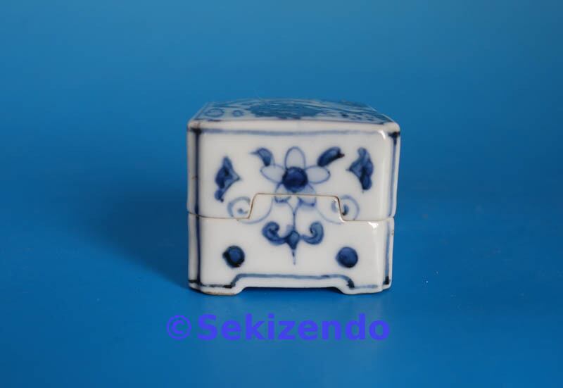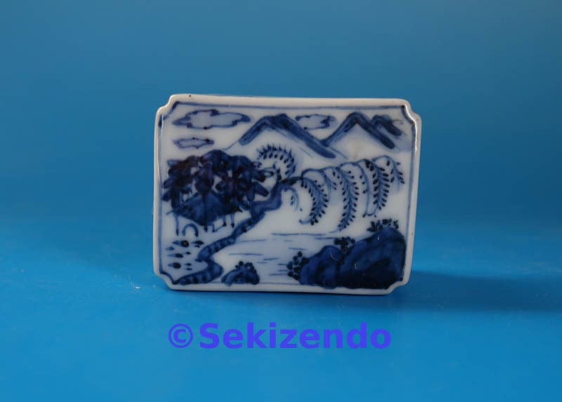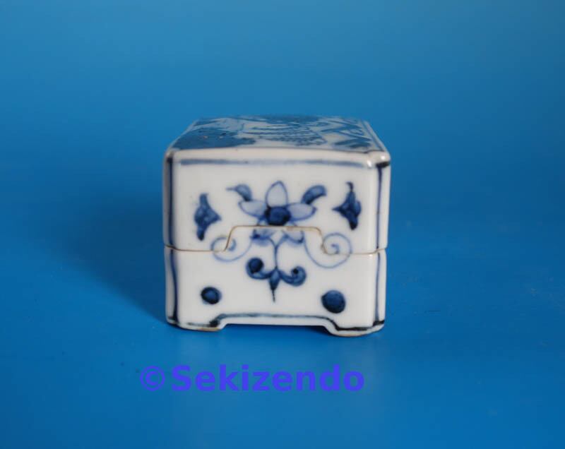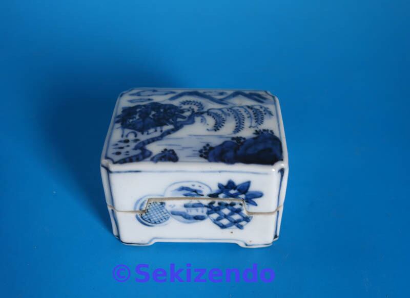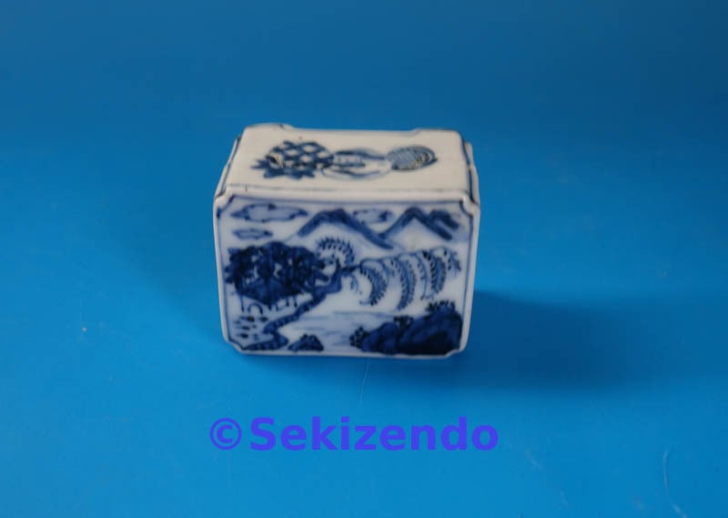 本商品は中国美術 青花 染付 四方 香合 山水図 香道具 盒子 蓋物 古美術品 景徳鎮窯 明・清時代・17世紀 です。