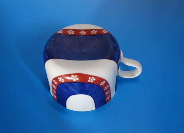 濃い染付と金襴手と呼ばれる赤や金の絵の具を贅沢に使った様式です。「柿右衛門」「鍋島藩窯」何れの様式でもないもの